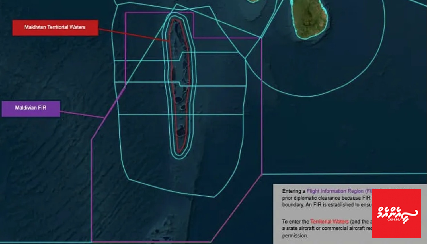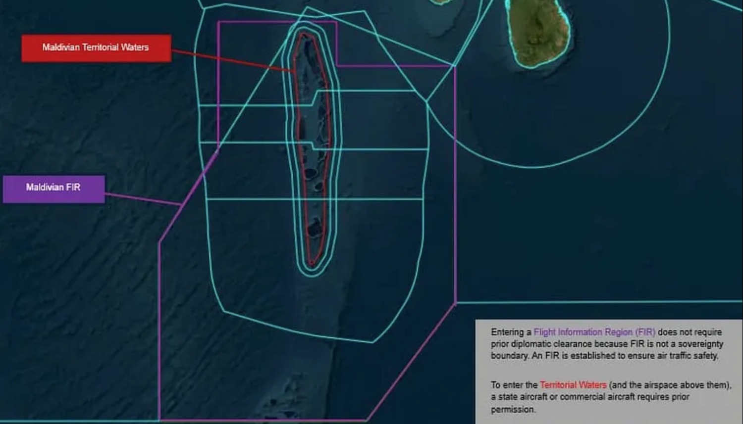 ޑިފެންސް މިނިސްޓްރީން ސޯޝަލް މީޑިއާގައި ކުރި ޕޯސްޓެއްގައި، ގައުމެއްގެ ކަނޑާއި ވައިގެ ސަރަހައްދު ގާނޫނީ ގޮތުން ކަނޑައެޅިފައި އޮންނަ ގޮތް ބަޔާންކޮށްދެމުން ބުނީ ގައުމުތަކުގެ ވައިގެ ސަރަހައްދުތަކާއި، ވައިގެ ދަތުރުފަތުރުގައި އަމަލުކުރާ މައިގަނޑު އުސޫލުތައް ބަޔާންކުރާ "ކޮންވެންޝަން އޮން އިންޓަނޭޝަނަލް ސިވިލް އޭވިއޭޝަން (ޗިކާގޯ ކޮންވެންޝަން) ގައި ބަޔާންކުރާ ގޮތުން ގައުމުތަކުގެ ސަރަހައްދީ ކަނޑާ ގުޅިފައިވާ ވައިގެ ސަރަހައްދަކީ އެ ގައުމުގެ ސިޔާދަތީ ބާރު ހިނގާ، އަދި އެ ސަރަހައްދަށް ވަނުމުގެ ކުރިން ހުއްދަ ހޯދަންޖެހޭނެ ސަރަހައްދެއް ކަމަށެވެ.