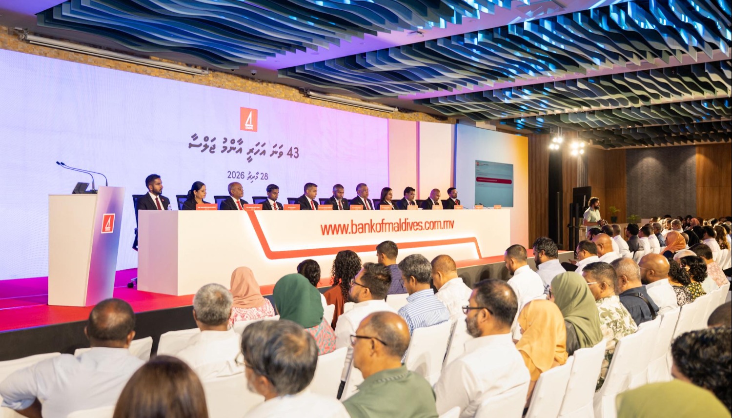 ބޭންކް އޮފް މޯލްޑިވްސް، ބީއެމްއެލްގެ އަހަރީ އާންމު ޖަލްސާގައި 2025 ވަނަ އަހަރުގެ ހިއްސާގެ ފައިދާގެ ގޮތުގައި ހިއްސާއަކަށް 60 ރުފިޔާގެ މަގުން ރެކޯޑު އަދަދެއްކަމަށްވާ ޖުމްލަ 322 މިލިއަން ރުފިޔާ ބެހުމަށް ވަނީ ފާަސްކޮށްފަ އެވެ.