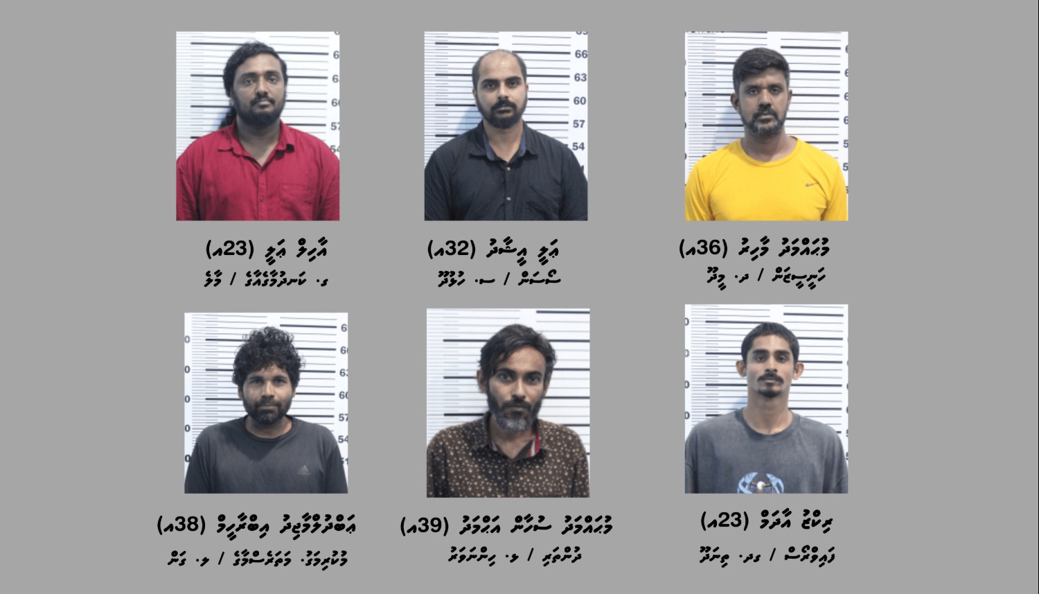ފުލުހުން ބުނީ މި މައްސަލައާ ގުޅިގެން ހައްޔަރުކޮށްފައި ވަނީ ދ. މީދޫ / ހަނީސީޒަން ، މުހައްމަދު މާހިރު (36އ) އާއި ސ. ހުޅުދޫ / ސޯސަން، އަލީ އީޝާދު (32އ) އާއި މާލެ / ގ. ކަނދުމާގެއާގެ، އާހިލް އަލީ (23އ) އާއި ގދ. ތިނަދޫ / ފައިވްރޯސް، ރިކްޒު އާދަމް (23އ) އާއި ޅ. ހިންނަވަރު / ދުންތަރި، މުހައްމަދު ސުހާން އަހްމަދު (39އ) އާއި ލ. ގަން / މުކުރިމަގު. މަތަރެސްމާގެ، އަބްދުލްމާޖިދު އިބްރާހީމް (38އ) އެވެ.