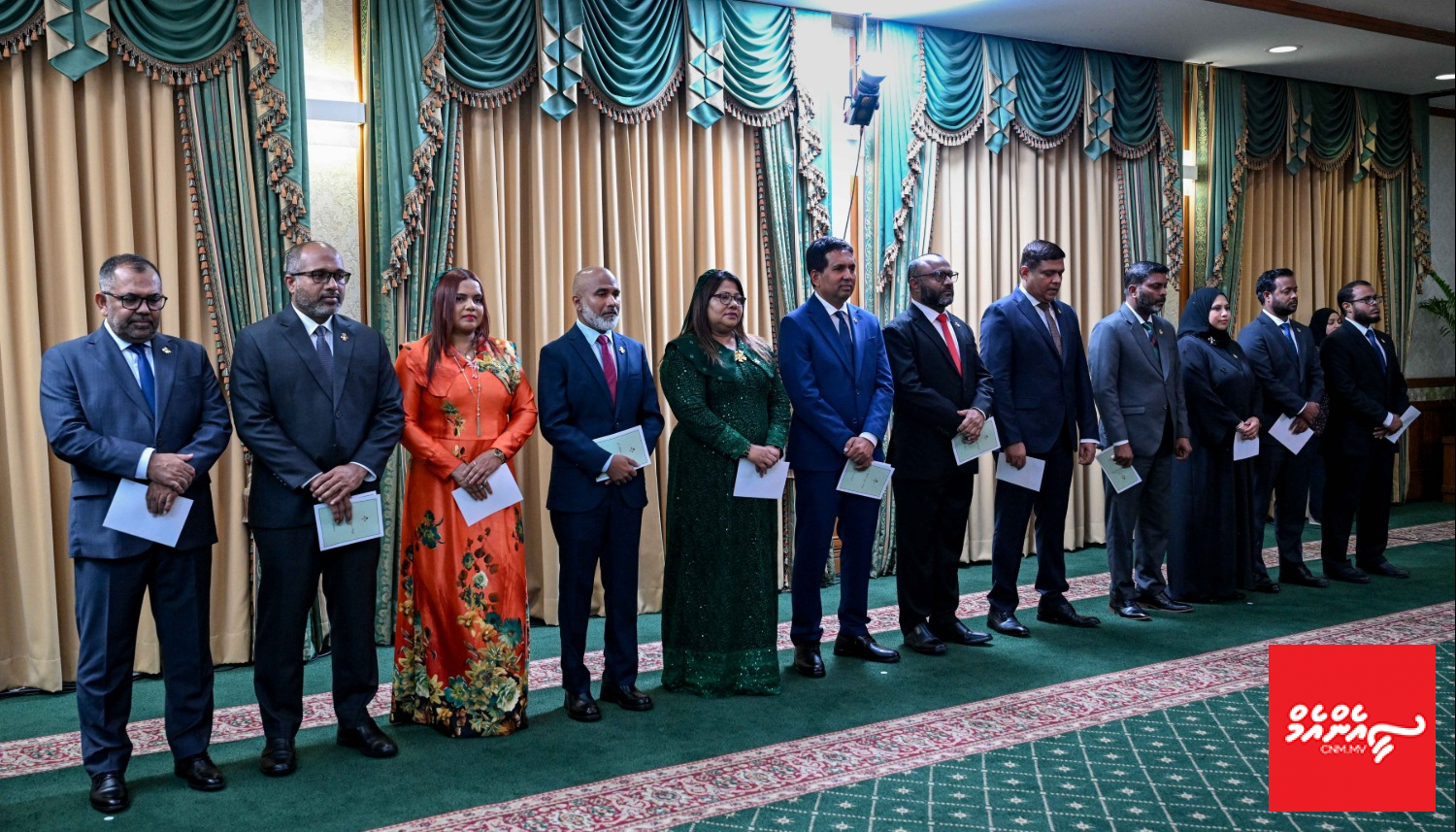 ރައީސް އޮފީހުގައި މިރޭ ބޭއްވި ރަސްމިއްޔާތުގައި 12 މިނިސްޓަރަކު ވަނީ މަގާމުގެ ހުވާ ކުރައްވާފައެވެ. އޭގެ ތެރޭގައި އަލަށް ކެބިނެޓަށް އައްޔަންކުރެއްވި ހަތަރު މިނިސްޓަރަކުވެސް ހިމެނިވަޑައިގަންނަވައެވެ.
