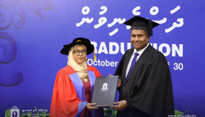 ގައުމީ ޔުނިވަސިޓީން 2019 ވަނަ އަހަރު ފެށި ޕީއެޗްޑީ ޕްރޮގްރާމް ފުރިހަމަކުރެއްވި އައިމިނަތު ޒާހިރަށް އެ ސަނަދު އެރުވީ އިއްޔެ ބޭއްވި ދަސްވެނިވުމުގެ ރަސްމިއްޔާތުގަ އެވެ.