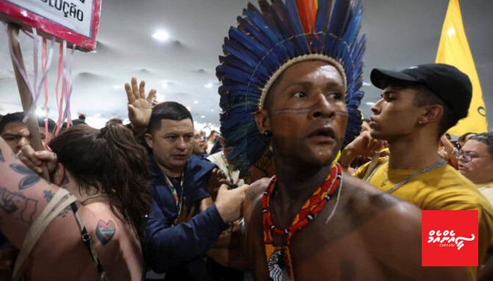 "އަހަރެމެންގެ ޖަންގަލިތަކަކީ ވިއްކާ އެއްޗެއް ނޫން" ކަމަށް ގޮވަމުން، ސެކިއުރިޓީ ބެރިއާތައް ފޫއަޅުވާލައި އެތެރެއަށް ވަނުމުން، ސަމިޓުގެ ބައިވެރިންނަށް އިމާރާތުގެ ތެރޭގައި ކުޑަ ވަގުތުކޮޅަކަށް މަޑުކުރަން ޖެހުނެވެ.