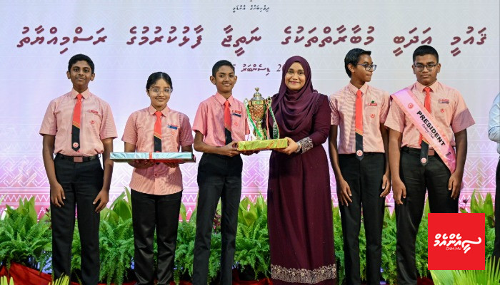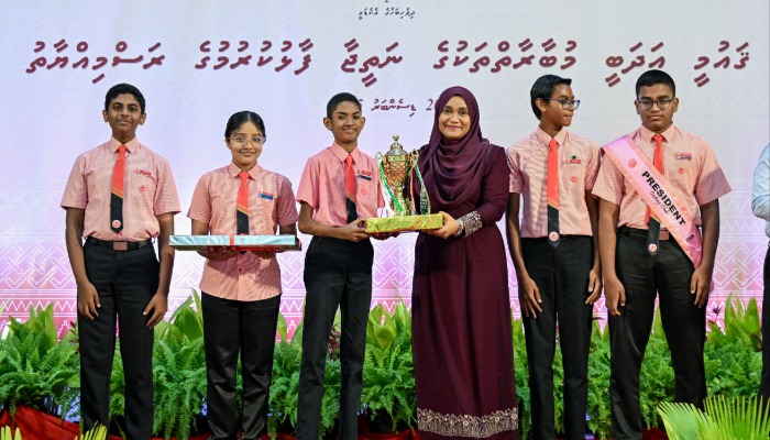 ދިވެހިބަހާ ބެހޭ މިނިސްޓްރީން މި އަހަރު ކުރިއަށް ގެންދިޔަ އަދަބީ މުބާރާތްތަކާއި އަތުލިޔުން މުބާރާތުގެ އިނާމުދިނުމުގެ ރަސްމިއްޔާތުގައި ރައީސް ޑރ. މުހައްމަދު މުއިއްޒު ކުއްޖަކަށް އިނާމު ހަވާލުކޮށްދެއްވަނީ - ފޮޓޯ: ރައީސް އޮފީސް