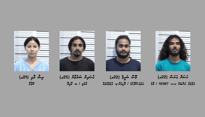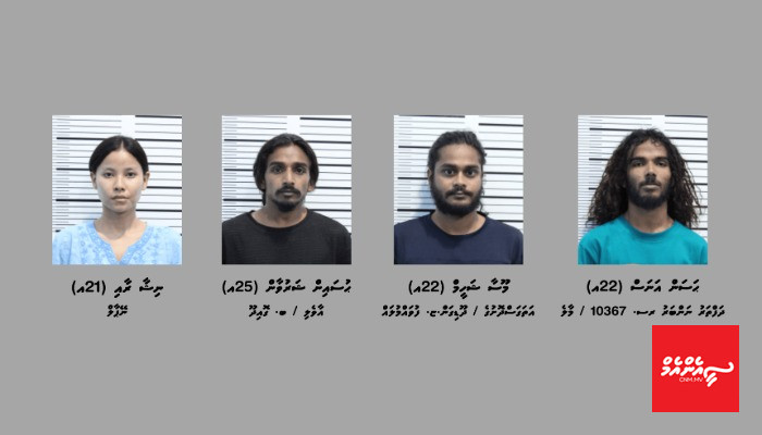 މިމައްސަލާގައި ހައްޔަރުކޮށްފައިވަނީ ދަފްތަރު ނަންބަރު ރސ. 10367 / މާލެ، ހަސަން އަނަސް (22އ) އާއި އަތަގަސްދޮށުގެ / ދޫޑިގަން.ޏ. ފުވައްމުލައް، މޫސާ ޝަހީމް (22އ) އާއި އާވެލި / ބ. ގޮއިދޫ، ހުސައިން ޝަރުވާން (25އ) އަދި ނޭޕާލް ރައްޔިތެއްކަމަށްވާ ނިޝާ ރާއި (21އ) ކަމަށް ފުލުހުން ބުނެ އެވެ.