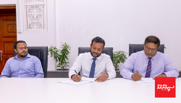 ފަރެސްމާތޮޑާގެ ބިން ހިއްކުމާއި ގޮނޑުދޮށް ހިމާޔަތްކުރުމުގެ މަޝްރޫއު އެމްޓީސީސީ އަދި ފިޔޯރީގެ މަގު ހެދުމުގެ މަޝްރޫއު އާރުޑީސީއާ ހަވާލުކުރުމުގެ އެއްބަސްވުމުގައި ކޮންސްޓްރަކްޝަން މިނިސްޓްރީގެ ފަރާތުން ސޮއިކުރެއްވީ މިނިސްޓަރު ޑރ. އަބްދުﷲ މުއްތަލިބެވެ.