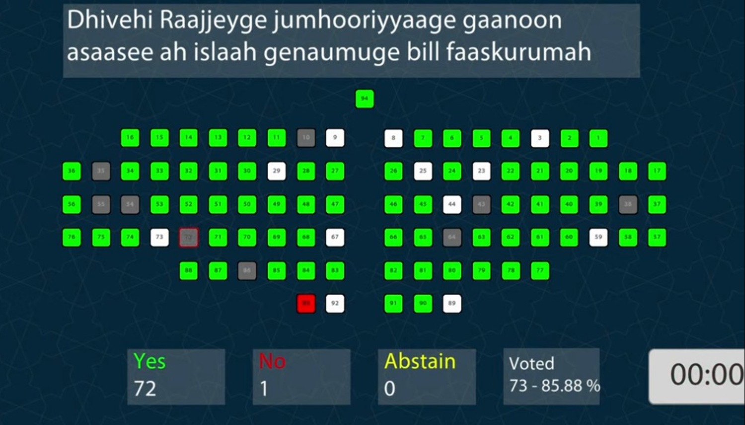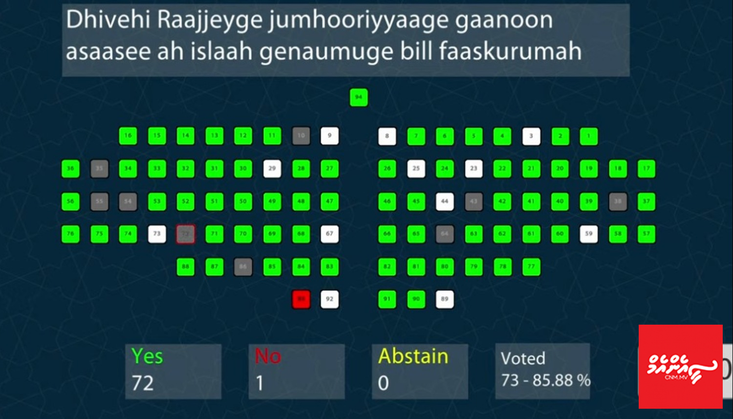 މި ބިލު މަޖިލީހުން ފާސްކުރީ 72 މެމްބަރުން ވޯޓުންނެވެ. އިދިކޮޅަށް ވޯޓް ދެއްވީ އެއް މެމްބަރެކެވެ.