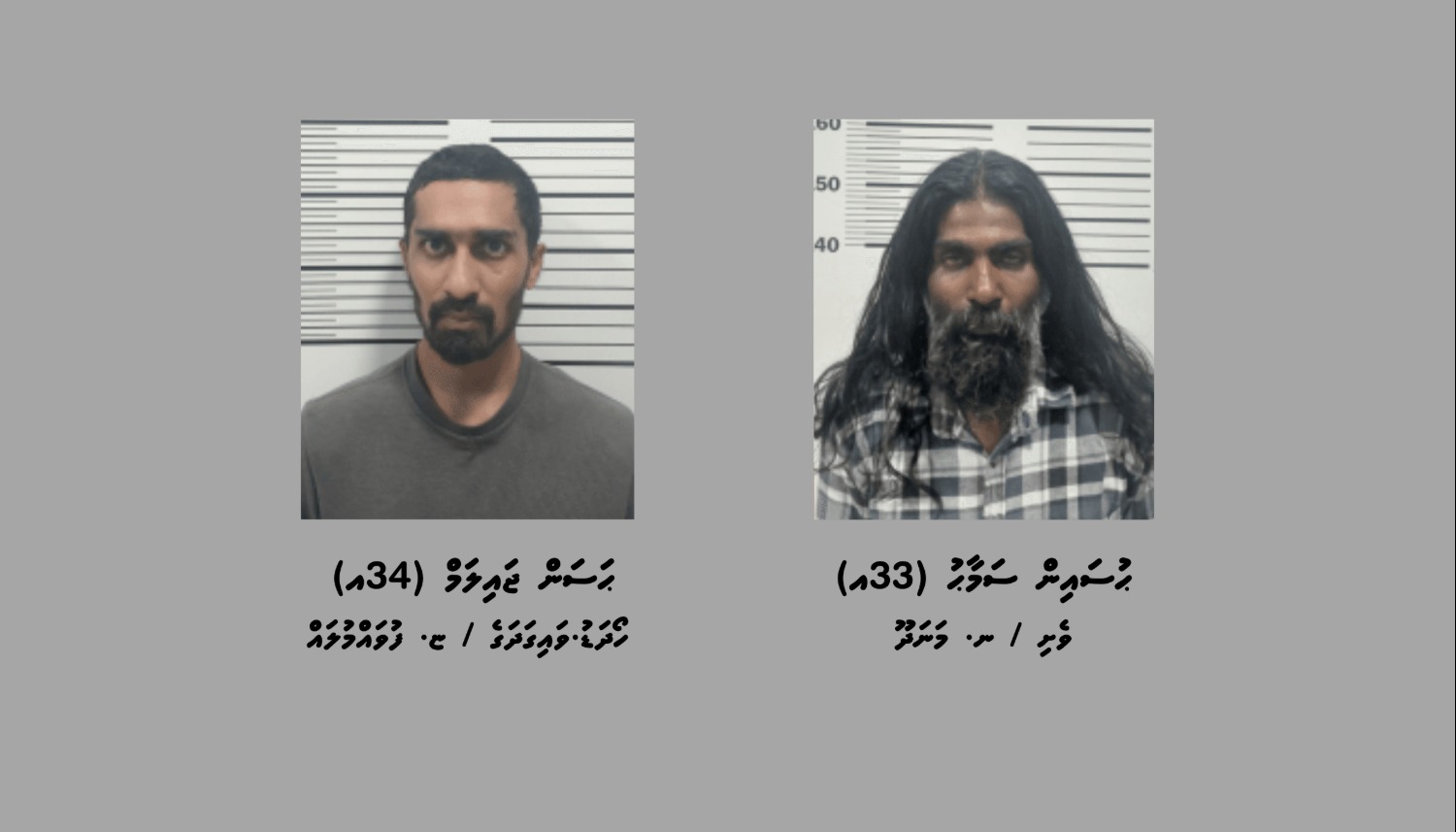 ފުލުހުން ބުނި ގޮތުގައި މި މައްސަލައާ ގުޅިގެން ހައްޔަރުކޮށްފައި ވަނީ ނ. ވެލިދޫ / ވެށި، ޙުސައިން ސަމާޙު (33އ) އާއި ޏ. ފުވައްމުލައް / ހޯދަޑު.ވައިގަދަގެ، ޙަސަން ޖައިލަމް (34އ) އެވެ.